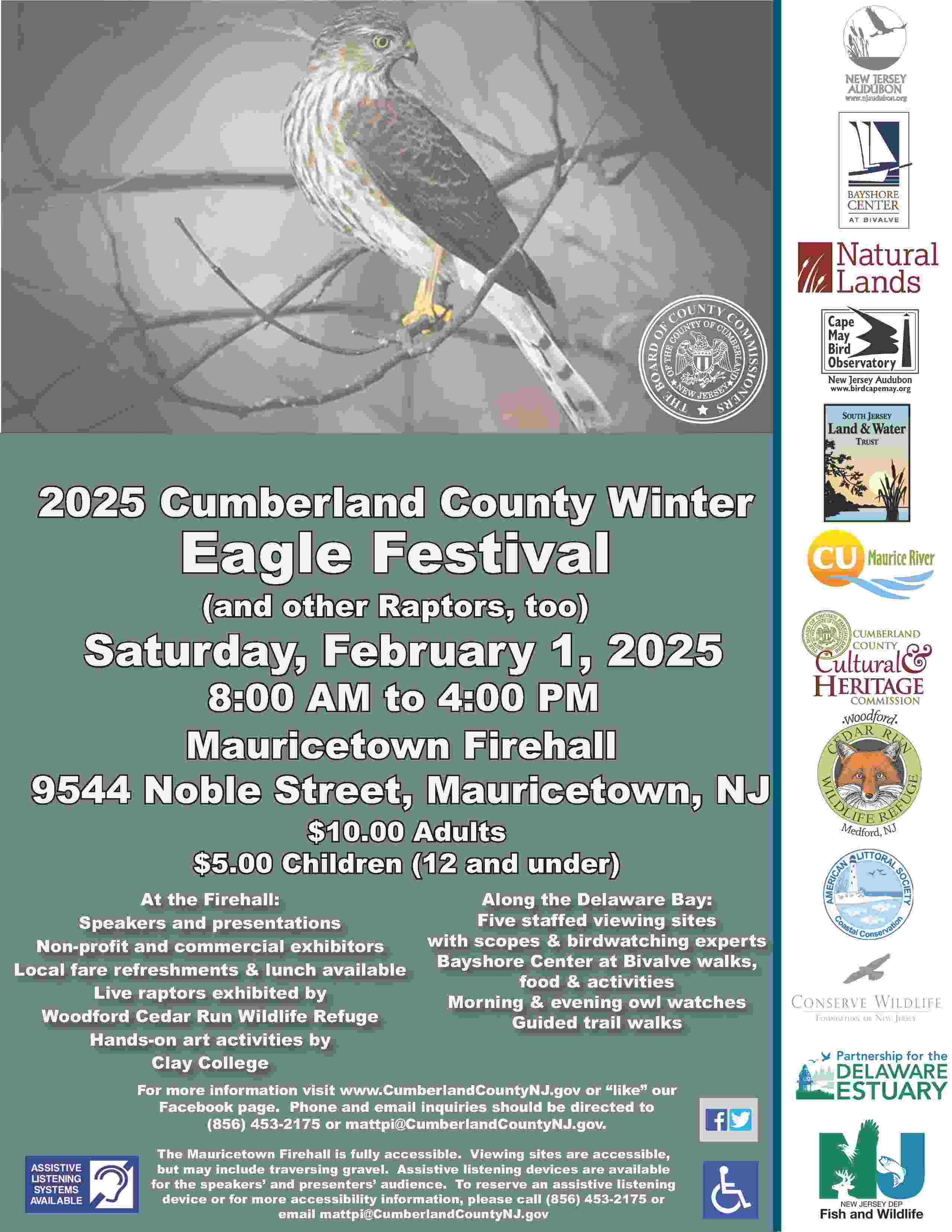 The 2025 Cumberland County Winter Eagle Festival is made possible in part thanks to the support of New Jersey Audubon, Bayshore Center at Bivalve, Natural Lands, Cape May Bird Observatory, South Jersey Land & Water Trust, CU Maurice River, Cumberland County Cultural & Heritage Commission, Woodford Cedar Run Wildlife Refuge, American Littoral Society, Conserve Wildlife Foundation of New Jersey, Partnership for the Delaware Estuary, New Jersey Department of Fish and Wildlife.
